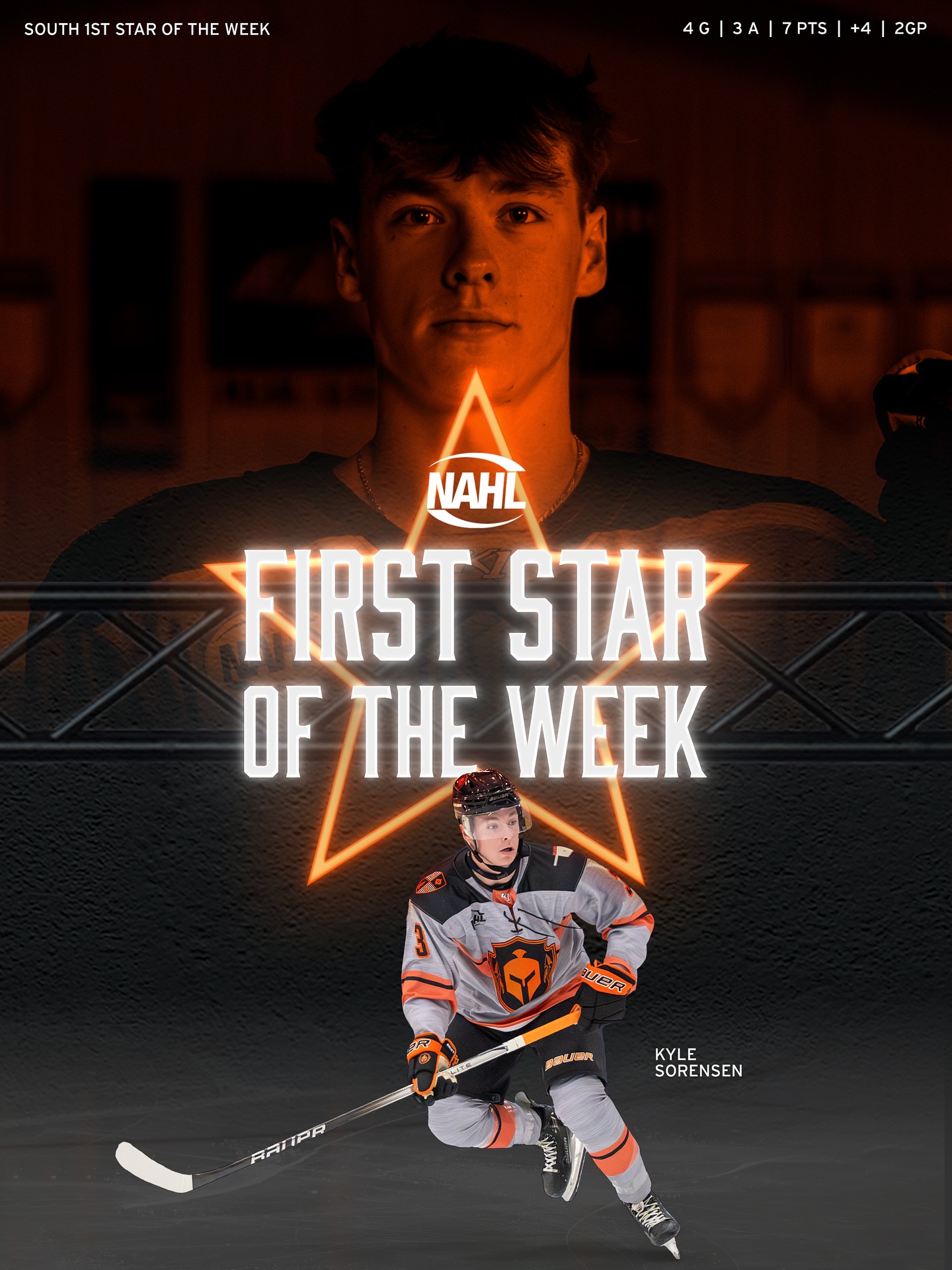OKLAHOMA CITY, OK, OCTOBER 20TH, 2025 — Oklahoma Warriors’ Forward, Kyle Sorensen, was named the North American Hockey League’s South Division 1st Star of the Week on Monday afternoon. The award comes on the heels of a 7 point weekend for Sorensen as he scored 4 goals and assisted on 3 more. Kyle’s recognition is the first time a Warrior player has been 1st star for the South in over a year. Additionally, with his 7 point weekend, Kyle has now tied his entire point total of last year (14) just 13 games into the season. After scoring 14 goals this weekend against the Wranglers, the awards aren’t quite finished. Ben Likness was also recognized as the South Division’s 3rd Star of the Week in Monday’s update. Likness equaled his teammate in points with 7 this weekend, however all 7 points came from assists. Several of those apples too, could easily be considered a top play of the week.