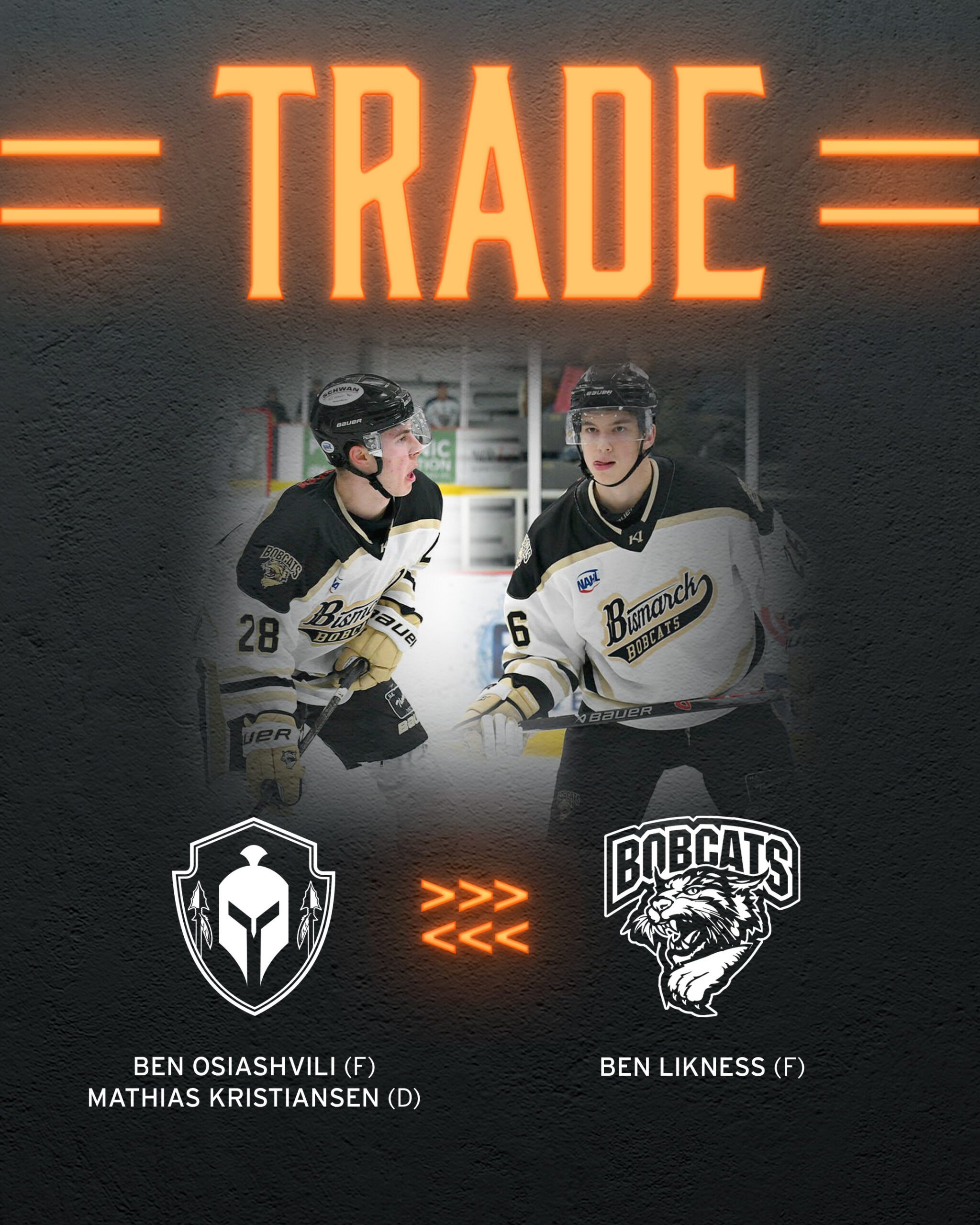 OKLAHOMA CITY, OK, FEBRUARY 4TH, 2026 — The Oklahoma Warriors finalized a trade with the Bismarck Bobcats to send (F) Ben Likness to Bismarck in exchange for (F) Ben Osiashvili and (D) Mathias Kristiansen. The trade is the first of several made by the Warriors ahead of this week’s trade deadline. Osiashvili is an ’06 from Hewlett, NY and has played in 61 USHL games as well as 29 NAHL games during his junior career. He’s listed at 5’10, 176 lbs and is a right-handed shot. Osiashvili also is committed to NCAA Division 1 Colorado College. Kristiansen is also an ’06 with considerable junior experience. The defenseman from Oslo, Norway has has played in 24 NAHL games after working through the ranks of Norwegian hockey. Mathias is listed at 6’0, 176 lbs and is also a right-handed shot.
