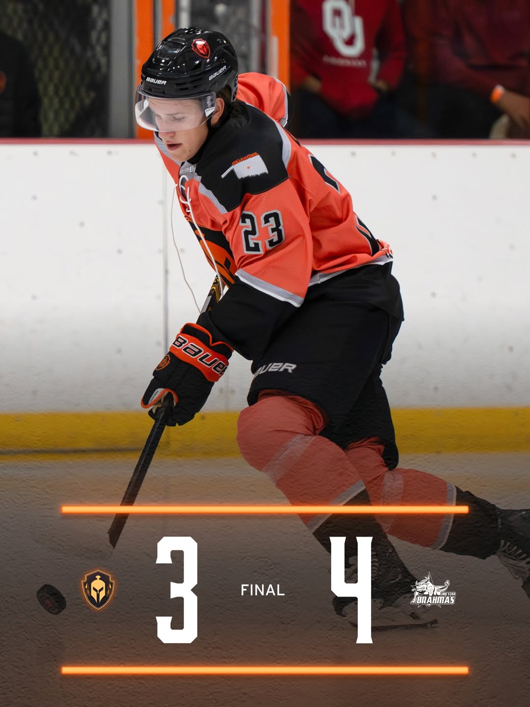 NORTH RICHLAND HILLS, TX, NOVEMEBER 26TH, 2025 — The Warriors dropped a thriller to the Lone Star Brahmas on Wednesday night in Texas, 4-3. By far the best game in a loss Oklahoma has had all season, the Warriors came up just seconds short of finding the tying goal in the final frame. Lone Star scored 3 goals on the power play in the contest, showcasing why they are the number one team in the league with the extra attacker. For the Warriors, William-Francisco Parent had one his best games of the year in just two periods, before leaving in the 3rd with an injury. He scored twice in the 2nd period. Once on a highlight reel play, and then another just a few minutes later on a net-front deflection to give Oklahoma the lead. The Brahmas would fight back with a pair of goals to open the 3rd period and despite Jaxson Kaebel’s goal down two, the Warriors just couldn’t find a tying 4th goal. Oklahoma was dominant in some areas – something they have struggled mightily with against these Brahmas for the last couple years. Despite the loss, the Warriors play tonight is an encouraging sign for games to come. Additionally, the Warriors outshot the Brahmas tonight 29-28. Oklahoma has the rest of the weekend off and will square up at home with the El Paso Rhinos next weekend. Tickets are available at OKWarriors.com